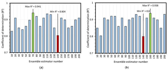 The RF is an ensemble machine learning approach based on weak learners which gives the finest model on the basis of R2 value. The RF model applied in the present study randomly divided the whole dataset into 20 sub-models based on ensemble n-estimators. Among all the sub-models, the optimized model provided the best R2 value, as depicted in Figure 7a,b for the TDS and EC models, respectively. All the sub-models for the TDS have R2 values above 0.75, with an average value of 0.9221, indicating that each of the sub-models correlated with the TDS-predicted and actual data. Among all the 20 sub-models, the maximum and minimum R2 for the TDS was found to be 0.941 and 0.805, with 70 and 140 estimators, respectively. Furthermore, among the sub-classes for the EC model, the mean and maximum R2 value turned out to be 0.928 and 0.938, respectively.