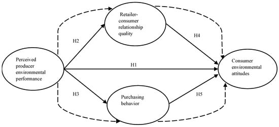The sustainability literature has examined the relationship between environmental awareness and consumer green purchasing behavior [,,,]. However, the research focuses only on consumer perception of producers’ environmental performance in the retail environment [,,,]. The relationship quality research focuses only on examining the relationship between environmental performance and interfirm relationships, mainly in the supply chain environment [,,,]. Interfirm collaboration is beneficial to a firm’s overall environmental performance []; this represents a gap in the literature. In this study, the theory of perceived corporate social responsibility as a part of perceived corporate environmental performance [] is integrated with the theory of retailer-consumer relationship quality [,]. Therefore, this study describes how the impact of producer’s environmental performance on retailer-consumer relationship quality and consumer purchasing behavior drives consumer environmental attitudes. In particular, this study examines the effect of producer environmental performance on retailer-consumer relationship quality and consumer purchasing behavior simultaneously, and the mediating effect of retailer-consumer relationship quality and consumer purchasing behavior drives the effect of producers’ environmental performance on consumers’ environmental attitudes.