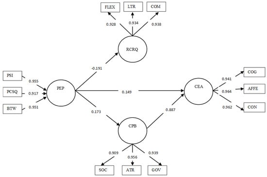 The perceived producer’s environmental performance construct was the only formative construct in this study. Table 3 shows that the significance of weight values exceeded the thresholds of 0.70. The Variable Inflation Factor (VIF) values did not exceed the threshold of 5.0, which means that all indicators met the indicator reliability criteria, indicating that the absence of collinearity indicators was due to the presence of the formative construct []. Finally, the perceived producer’s environmental performance met a formative construct’s indicator reliability and collinearity criteria.