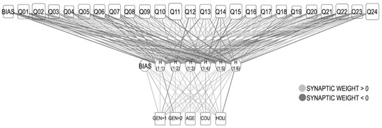 The architecture of the ANN achieved is presented in Table 2, and graphically, in Figure 2. The input layer is made up of the different neurons that correspond to the questions asked in the survey and the input values which are incorporated, which have to be standardised before incorporating them into the network. Subsequently, these values are multiplied by their respective synaptic weights (Figure 2) that take values higher or lower than zero, giving rise to the different values of the hidden layer, to which a hyperbolic tangent activation function is applied (Table 2). These values are in turn multiplied by the synaptic weights from the hidden layer to the output layer, giving rise to the different output values, corresponding to the items of the students’ profiles. The values that do not require additional modifications as identity function (that is, without transformation) are applied. However, they should invert their standardisation to reflect the estimations as specified in Table 2 (dependent variables).