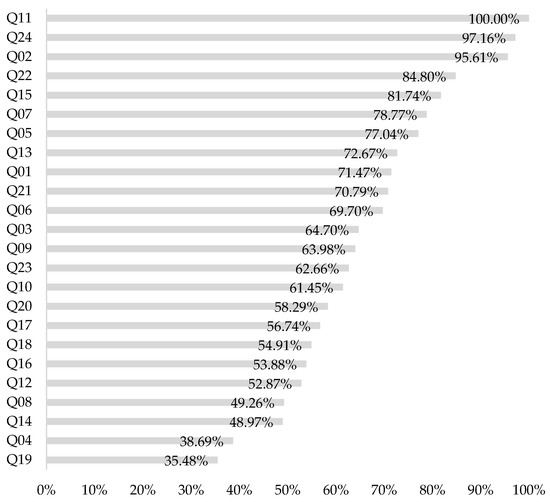 The ANN also allows for the quantifying of the relevance that each of the input values contributes to itself (Figure 3). In this case, the awareness that sustainable development should be a priority for the rulers (Q11), the willingness to collaborate in the process of sustainable development from the school (Q24), or the vision of sustainable development as a contributor to cultural diversity (Q02) appear as the most influential in the development of the network. On the other hand, factors such as the purchase of local products (Q19) or the maintenance of biodiversity (Q04) appear as the least relevant for it.