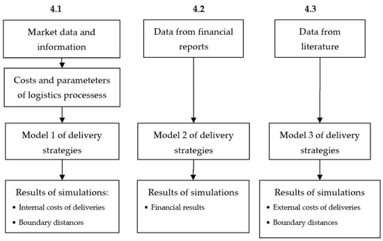 For each of these variants, simulations were carried out for two levels of production and annual sales, “lower sales” and “higher sales” (four times higher), to check whether the efficiency of these deliveries is influenced by the scale of operations.