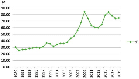 The banking sector in the UAE experienced positive developments from 1989 to 2019. In this context, the value of the local credit from the banks to the private sector as a share of the GDP in 2019 was roughly seven times higher than the value in 1989. It rose to 74% in 2019, compared to 30% in 1989 (see Figure 1). However, the development of the banking system is an essential issue for the UAE, which aims to double the size of its economy over the next decade. Environmental degradation negatively affects the promotion of inclusive and sustainable economic growth in this country. Therefore, policymakers need to devote more attention to the consequences of economic policies on CO2 emissions and renewable energy. One of the main significant factors in renewable energy consumption is financial sector development. In essence, the financial sector makes decisions about who to lend to and in what to invest. Therefore, their choices affect business practices and investment [6]. Some types of renewable energy, such as solar energy projects, are considered an expensive investment. This type of investment requires a high initial cost and long-term loans. In this context, the financial sector helps the investors obtain the lending capital, which facilitates their expansion of the production scale, including the use of more equipment, thereby significantly increasing the energy levels [7]. Furthermore, the financial sector creates investment opportunities for the markets by increasing confidence for investors, which further lessens the capital cost and risk. Financial advancement widens the investment opportunities across the borders that facilitate the adoption of the latest technological energy-efficient products [8]. However, when the financial sector provides funds for the investors, this boosts the total factor productivity and the capital accumulations, thereby increasing the real income and the energy consumption [9]. By taking the influence of the financial sector on energy consumption into consideration, the current research can test the impact of financial sector policies on the consumption of renewable energy. In fact, the financial industry plays a crucial role in the attainment of economic and financial stability through the credit they provide to the markets and individuals. The financial sector should use this credit to support investment in renewable energy sources.