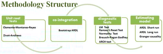 where ∆ symbolizes the operator of the first difference; symbolizes the error term; and is the lagged ECT. The causal linkage between the tested variables in the short-run level is tested applying the Wald test’s (F)statistics [58]. Figure 2 shows the methodology structure of this research.