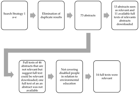 Of the 73 downloaded abstracts obtained through strategy 1a–e, only 13 were relevant. An abstract was deemed relevant when it mentioned disabled individuals in relation to EE. Within the 13 relevant abstracts, the following terms used were to refer to disabled individuals: disability (seven abstracts), disabled (six abstracts), impaired (two abstracts), disabled people (two abstracts), children with cognitive limitations (one abstract) and people with learning difficulties (one abstract).