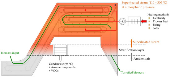 The core technology of the developed biorefinery concept is the superheated steam (SHS) processing under atmospheric pressure. This technology has been originally developed for drying purposes in the early 1990s [24], then further developed by Fraunhofer IGB for torrefaction within the EU project SteamBio (https://www.steambio.eu/ (accessed on 6 December 2021)). The use of SHS and thus the absence of oxygen permits an inert processing, prevents oxidation of the product and significantly reduces the risk of explosion.