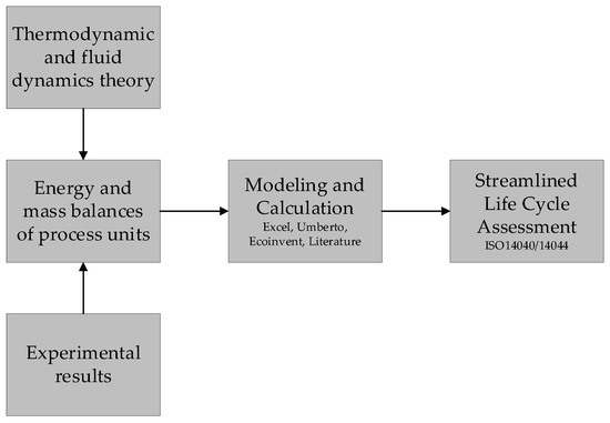 Figure 3 shows the basic methodology used in this work. For each process step, the energy and material balances were drawn up on the basis of thermodynamic and fluid mechanics principles as well as experimental results. These balances formed the basis for the assessment of the environmental impact. The environmental impacts were carried out in accordance with ISO 14040 and 14044.