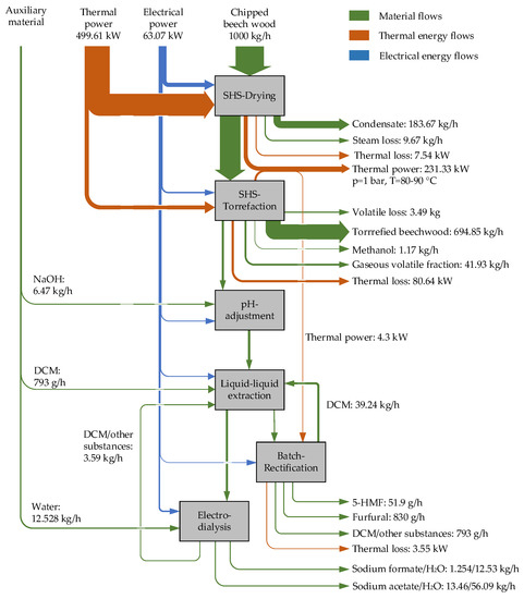 - Schöppe, H.; Kleine-Möllhoff, P.; Epple, R. Energy and Material Flows and Carbon Footprint Assessment Concerning the Production of HMF and Furfural from a Cellulosic Biomass. Processes 2020, 8, 119. [Google Scholar] [CrossRef] [Green Version]