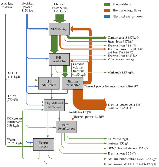 The torrefied biomass has a higher heating value (HHV), approx. 22 MJ/kg, and can be utilised either as a very clean fuel with coal-like characteristics, as a raw material for further use in activated carbon production or for the production of synthesis gas. The non-condensable volatile fraction (CO, CO2, CH4, H2) from torrefaction cannot be further utilised and is released to the environment in the reference case. The valuable substances 5-HMF, furfural, sodium formate and sodium acetate are produced in small quantities but high purities (>95%). The pilot tests have shown that about 20 different chemical substances can be extracted. However, only the above-mentioned platform chemicals are shown here, as they represent the largest share in terms of quantity. Dichloromethane is used as extraction agent and can be recovered up to 98% in the rectification unit.