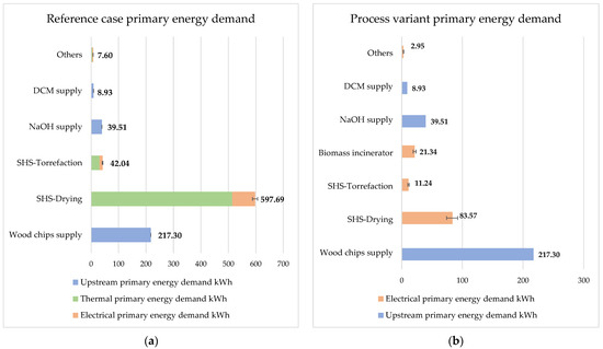 If the primary energy consumptions for processing 1000 kg of biomass per hour for both variants are added up counting 5% steam loss, the result is 913.07 kWh for the reference case and 384.84 kWh for the process variant. The significant difference in primary energy demand is due to the fact that in the process variant the required thermal energy is provided internally by a biomass incinerator. Figure 6 also shows the distribution of primary energy demand for both variants when varying the primary energy demand for the individual process steps according to Table 3. The SHS-drying process consumes the most primary energy in the reference case, followed by the biomass supply chain, whereas the biomass supply chain consumes the most primary energy in the process variant, followed by the SHS drying. The process variant includes an additional electrical energy consumer, a biomass incinerator with a primary energy demand of 21.34 kWh per hour.