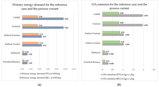 Figure 8a represents a comparative representation of the primary energy demand required to produce one kilogram of the respective end product for both variants. It clearly shows for the reference case that the products 5-HMF and furfural have the highest primary energy requirement per kilogram, with 9.6 kWh each, followed by sodium formate and sodium acetate, with 4.5 kWh each. It can be seen that the primary energy demand for the process variant is significantly lower because the required thermal energy is covered by the incinerator; the same is true for CO2 emission. Figure 8b represents for both variants the CO2 emissions that occur when producing one kilogram of end product. The highest emission per kilogram occurs when producing 5-HMF and furfural for the reference case, and when producing sodium acetate and sodium formate for the process variant. The effect of the process variant is more significant on 5-HMF and furfural, because the thermal energy requirement during rectification has a significant weight on 5-HMF and furfural, and because this can be supplied internally in the process variant, the value of primary energy demand and CO2-emission is further reduced. The higher CO2 emission and primary energy demand of furfural, 5-HMF, sodium acetate, and sodium formate can be explained by the small amount of product produced and the number of steps required to obtain these products. Torrefied beech wood, on the other hand, emits the least amount of CO2 per kilogram. This is due to the small amount of beech wood input required to produce one kilogram of torrefied beech wood.