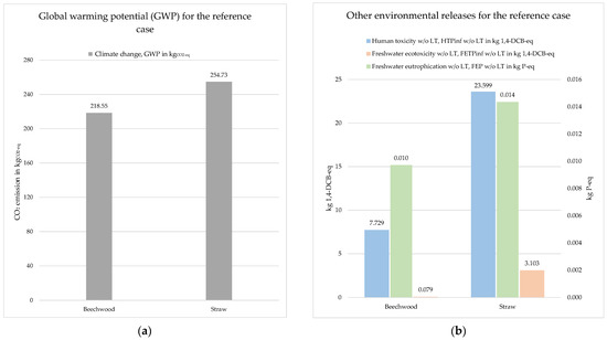 The results represented here are based on 1000 kg of biomass input of the two biomass residues considered. Figure 9a shows the global warming potential. The methodology used for the impact assessment was IPCC 2013, which takes the impacts of emissions over a period of 100 years into account. The total emission for the beechwood biomass is 218.55 kgCO2-eq. When using straw residues, the total emission is 254.73 kgCO2-eq. The additional 36.18 kgCO2-eq is caused by the straw supply chain, which has a CO2 footprint of 0.0908 kgCO2-eq/kg of straw, whereas the beechwood has a CO2 footprint of 0.0547 kgCO2-eq/kg of beechwood.