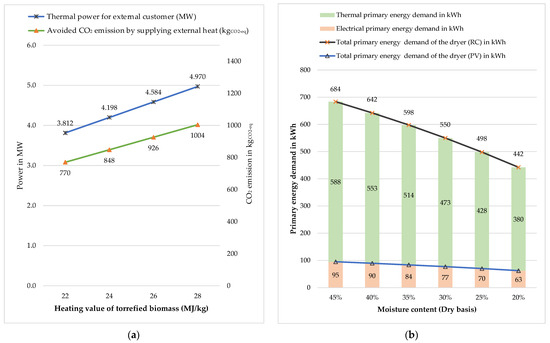 According to reference [32], the HHV of torrefied biomass ranges from 22 to 28 MJ/kg due to an increase in carbon content. The heat generated during biomass incineration and the thermal power available to external customers vary depending on the HHV of torrefied biomass. Figure 10a shows a sensitivity analysis concerning the HHV of torrefied biomass. The blue line represents the excess thermal power that could be sold to an external customer, and the green line represents the avoided CO2 emissions from supplying excess thermal energy in the process variant, assuming that it replaces natural gas consumption. Within the scope of this study, an HHV of 22 MJ/kg was considered. This value can be used as a reference value in the diagram, and all process variant calculations are based on it. At this value, the excess thermal power and avoided CO2 emissions are 3.81 MW and 769 kgCO2. From this reference point, an elevation of 2 MJ/kg of HHV increases thermal power and CO2 emissions by 10.12%.