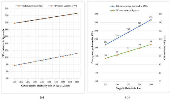 Sensitivity analysis: (a) CO2-emission for the reference case and process variant with different electricity mix; (b) biomass supply distance.
