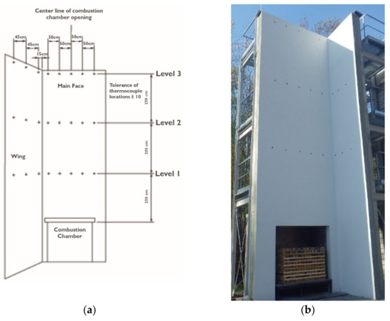 Test wall according to BS 8414-1: 2020 [10] (a) diagram showing the arrangement of measurement elements [10]; (b) removal of the wall before the test with a visible combustion chamber filled with a properly prepared pile of wood.