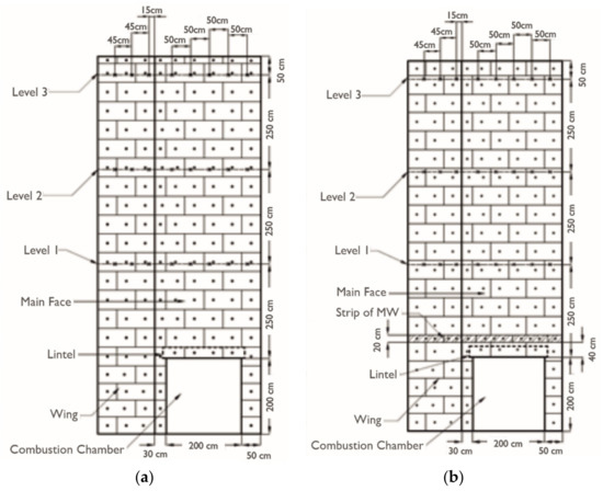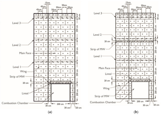 Figure 2. Scheme of the test wall: (a) ETICS made entirely of EPS—variant I, and (b) insulation made of EPS with a 20 cm strip of MW placed 40 cm above the combustion chamber lintel—variant II. - Insulation made of 150 mm thick EPS with a 20 cm wide MW partition located 40 cm above the upper edge of the combustion chamber (Figure 2b);