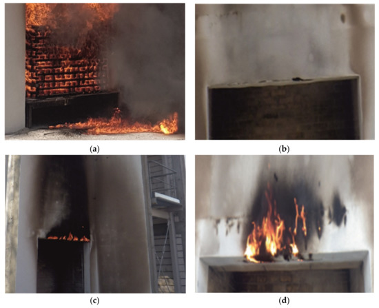 In the case of variant I, the leakage of molten polystyrene occurred 5 min after the test started due to the crack in the lintel. Molten polystyrene burned further out on the surface of the substrate in front of the combustion chamber (Figure 4a). In the case of variant II of the test wall insulated with EPS with a strip of MW placed 40 cm above the combustion chamber, a crack formed 4 min after the test started (Figure 4b). Flame combustion occurred in the lintel area. Further, single falling flaming drops were also observed. In the case of the remaining variants, there was no presence of falling drops.
