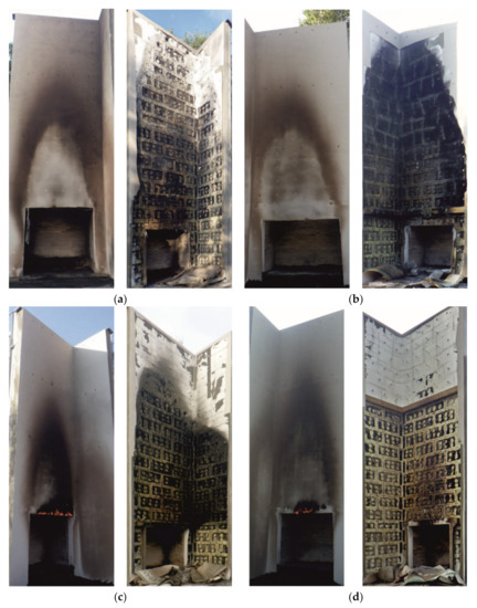 In all investigated variants, the reinforced insulation layer did not fall off during the test or after the test ended. Despite the EPS melting under the top layer, it was necessary to remove the top layer mechanically at the end of the test. After removing the top layer, the complete melting of the polystyrene on the test wall for variants I to III (Figure 5a–c) was observed. The complete melting of the polystyrene for variant IV (Figure 5d) occurred below the inter-story partition due to the heat deposition. EPS melting below the same MW partition occurred due to the hot gases’ formation from the thermal decomposition of exhaust polystyrene. When comparing the photos of variant II (Figure 5b) and IV (Figure 5d), a slight difference in the degree of polystyrene melting above 5 m from the combustion chamber has to be noted. Nevertheless, in both cases, no combustion in this area occurred. It means that no fire spread was observed through the insulation layer regardless of the use of MW.