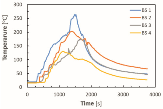 The duration of the tests for all samples was 60 min, which consisted of 30 min of exposure to fire and 30 min of observation of the system behavior after extinguishing the fire source. The basis for early termination of the test is (1) the propagation of the flame over the test apparatus, (2) a threat to the safety of personnel, and (3) damage to the measuring equipment.