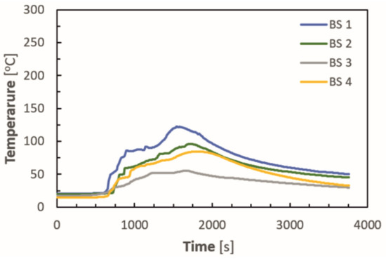 During the test, the temperature was measured using thermocouples placed in the measurement lines L1–L3. The results are presented as the average temperature values measured by individual thermocouples placed in the insulation material in the L2 measurement line (Figure 6) and the L3 measurement line (Figure 7).