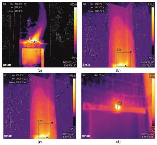 The visual observations showed the necessity to carry out a thermal imaging analysis of the insulated walls after the fire source was extinguished. In variant II–IV, flame combustion of molten polystyrene on MW belts was recorded (Figure 8a–d). In the case of variant IV, a dangerous phenomenon was observed, which is the transition of MW into a state of continuous smoldering.