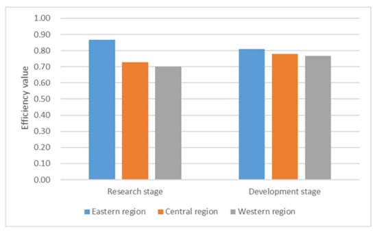To more intuitively compare the efficiency differences of each sector in the east, middle and west regions of mainland China, this paper divides each sector according to three major areas based on the measured efficiency averages of each province. It calculates the efficiency averages of each sector in each of the three major regions. This paper uses bar charts to compare the efficiency differences between the three major regions. The comparison result is shown in Figure 2. The figure shows that the Eastern region is the most efficient in the research and development divisions, followed by the central region, and the western region is the least efficient. This shows that the eastern region’s product development and product transformation efficiency is relatively the highest.
