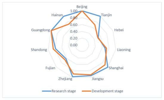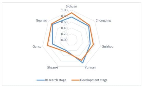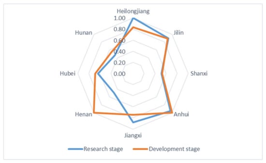 Figure 3, Figure 4 and Figure 5 describe the differences in the efficiency of research and development stages in different provinces under different regions. It can be seen from the figure that in the eastern region, the efficiencies of the two divisions in Beijing, Guangdong, Shanghai, Jiangsu, and Zhejiang are all equal to or close to 1. It shows that the ECEM industry in these provinces has sufficient inputs under the existing conditions. The output of scientific and technological achievements can be almost all converted into productivity. The innovation capacity of these provinces is good. The research efficiency of Hainan and Tianjin are both 1, which is significantly higher than the development efficiency. This shows that only part of the output of scientific and technological achievements in the ECEM industry is converted into productivity. Hebei, Liaoning, Shandong, and Fujian are all low in efficiency, indicating that their resource utilization and technological transformation capabilities are relatively low. In the central region, as shown in Figure 4, the efficiency of the development division in Anhui is 1. The efficiency of the research division is close to 1, so the innovation ability is good. While the efficiency of the development division in Henan province is 1, the efficiency of the research division is only 0.49, indicating that there is still much room for improvement in the efficiency of its product development. The efficiency of Jilin and Heilongjiang is relatively considerable, while that of Shanxi and Hubei is relatively low. In the western region, as shown in Figure 5, the efficiency of the two divisions in each province is generally low, and the difference is slight. However, it is not difficult to find that Yunnan province has the highest efficiency in the two divisions in the western region. Except for Yunnan province, the research efficiency of other provinces is higher than the corresponding development efficiency.
