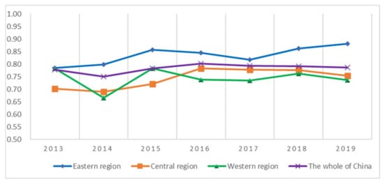 Figure 6 shows the changes in the period efficiency for the three major regions from 2013 to 2019. The trend of the folding line shows that in 2013–2014, the overall national efficiency values are on a downward trend. After 2014, the efficiency value of various regions across the country began to increase, inseparable from a series of related policies issued by China. In 2014 and 2015, China successively introduced the “Broadband China” particular action and “Made in China 2025”. The purpose is to improve informatization and promote the development of the country’s manufacturing industry as one of the five major industries in China’s high-tech industries. The electronics and communication equipment manufacturing industry has gradually improved its innovation efficiency under policies. Therefore, the innovation efficiency of the electronic and communication equipment manufacturing industry in all country regions improved substantially in 2014–2016. In recent years, the national innovation efficiency has stabilized. From the perspective of various regions, there are differences in the efficiency values of the eastern, central, and western regions. The innovation efficiency of the east region is higher than the national average, and the efficiency value is rising steadily. This is related to the superior geographical location and the denser industries in the high-tech zone. The innovation efficiency of the central and western regions is lower than the national average. There has been a steady or even a slight downward trend in recent years. This shows that although the state has introduced a series of supportive policies, the central and western regions have fewer innovation opportunities and resources than the eastern regions, so its innovation efficiency cannot increase substantially.