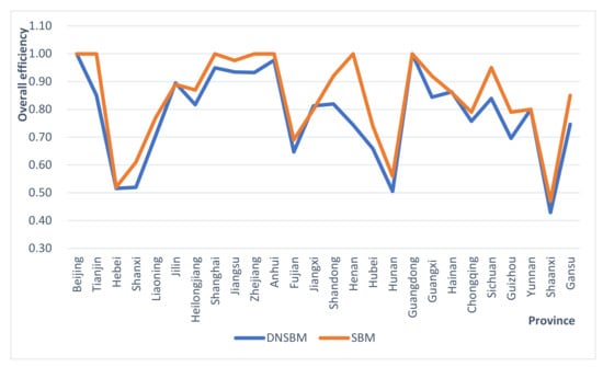 From the above analysis, it can be seen that there is some room for improvement in the innovation efficiency of the Chinese ECEM industry. Specifically, the development sectors in Tianjin, Liaoning, Shanghai, Anhui, Shandong, Guangxi, and Hainan provinces underutilize research results; most provinces have excessive upfront capital investment, resulting in wasted resources. This leads to an overestimation of the efficiency of the decision unit when using models that do not consider link and carry-over variables (e.g., SBM models). To do a comparative analysis, this paper chooses the input-oriented linear programming, sets variable returns-to-scale, calculates the efficiency value of each DMU by the SBM model. Then we compare it with the efficiency value calculated by the DNSBM model. The calculation results of the DNSBM model and the SBM model are shown in Figure 7.