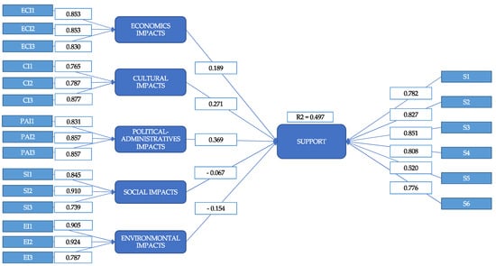 The results obtained from the analysis of the relationship between the impacts associated with residents’ perception of sports tourism and their predisposition to support its development in the community will be presented below. For this purpose, the model will be developed using PLS-SEM using a two-stage analysis approach. First, an evaluation of the measurement model is carried out, and then the structural model evaluation is completed.