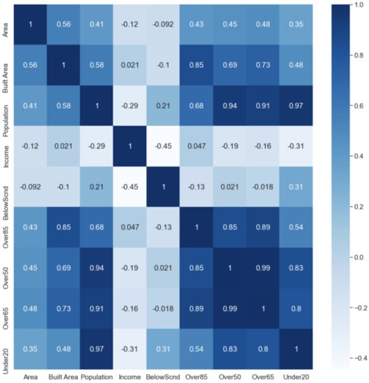 Figure 1 shows a heat map with the correlations between selected socio-ecomomic features.