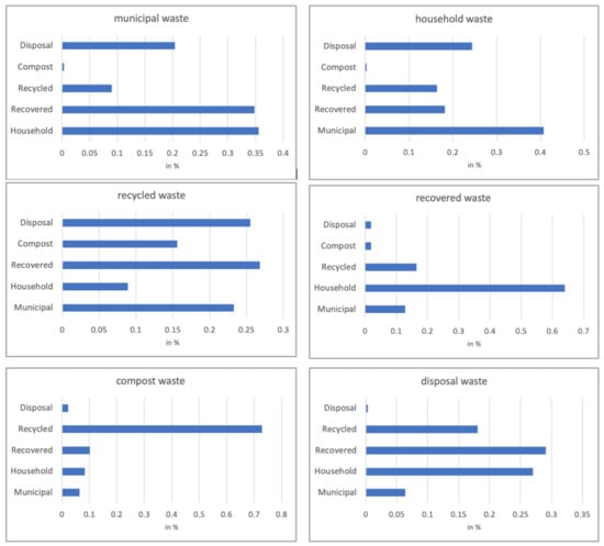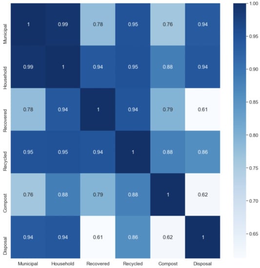 Two different classes of waste types can be distinguished. On the one hand, waste production can be associated with municipal, household, and disposal waste. By contrast, recovered, recycled, and compost waste correspond to waste reuse. The heat map shows that the correlation within these two clusters are very high. In addition, municipal waste, which comprises total waste, is highly correlated with all other waste types.