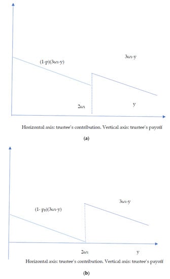 In Figure 1, we present a case where pp is low and the optimal strategy for the trustee with purely self-regarding preferences (i.e., maximizing her own payoff) is still y = 0, unless she has other-regarding preferences (i.e., inequity aversion, altruism, reciprocity). If this is the case, we assume that the borrower acting as a trustor in the trust investment game may anticipate it and choose x ≠ 0. Hence, interpersonal trust is required in addition to legal contracts to enforce the socially optimal outcome that ensures loan repayment from the borrower. In Figure 2, the legal system is strong enough to enforce the socially optimal outcome and interpersonal trust is not required.