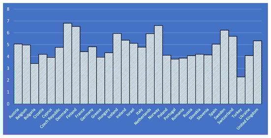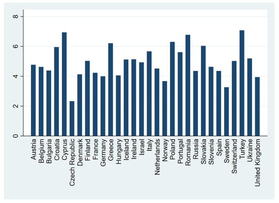 In order to overcome this problem, we follow the literature and propose as an identification strategy the use of religion as an instrument (e.g., Guiso et al., 2003) [34]. Our measure of religion also comes from the European Social Survey and measures the intensity of religious beliefs through the following question “How religious are you?”. The variable values range from 0 for the answer “Not at all” up to a value of 10 for the answer “Very Religious”. The average values for each borrower’s country are shown in Figure 3.