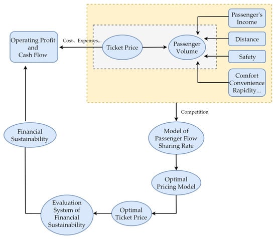 Figure 1 shows that the ticket price has an effect on financial sustainability by affecting the operating profit and cash flow of the enterprises. We should construct a pricing model based on the principle of profit maximization on the basis of fully considering market supply and demand, competition, and a passenger’s traveling choice so that we can obtain an optimal ticket price and explore the impact of this price on financial sustainability using the constructed evaluation system of financial sustainability.