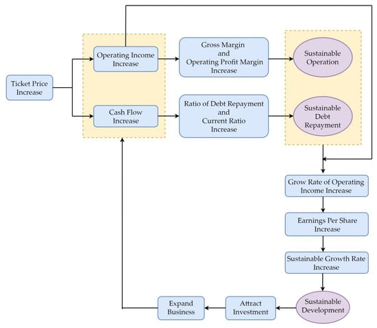 It can be seen that high-speed railways are inelastic. Therefore, for high-speed railroad transportation enterprises, appropriately increasing the ticket price within a reasonable range is conducive to increasing operating income, thereby enhancing the profitability, reducing liquidity risks, and promoting the sound and sustainable development of transportation enterprises. The impact mechanism of the ticket price on financial sustainability can be shown in Figure 2.