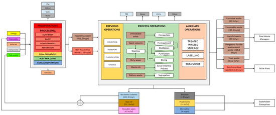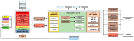 Before transporting, all waste must be labelled and allocated based on its danger. Outgoing residues are sorted according to current legislation. Some outgoing waste flows can be potentially polluting if not treated. Waste flows from preoperations include vehicle emissions as Particulate Matter (PM), Volatile Organic Compounds (VOCs) and unavoidable odours and noise pollution. The Processing block has both autobody repair and painting activities residues, due to the use of disposables such as pads, tapes, and adhesives. These are polluted with hazardous products, such as glues and paints. Regarding liquid change activity, spent fluids, their containers and disposable items to carry them out are the main residues. Reparations often involve outgoing hazardous residues such as disposable items, spent solvents and absorbents. However, other nonhazardous wastes such as old pieces and devices are delivered to scrapping facilities. Regarding final operations, the bringing-out activity involves the same emissions as when a vehicle is brought in. Outgoing residues are treated with both water and solid/liquid treatment to comply with spilling regulations. Waste generation from auxiliary operations is minimally quantified and is related especially with cleaning activities.