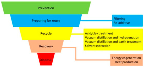 It is known that waste oils can be recovered with great environmental performances, so matter recovery becomes the first option [37]. The aim is to separate base oil from other pollutants such as water, bitumen, or heavy metals. The main alternatives are re-refining and straight burning, and each one includes several options [6].