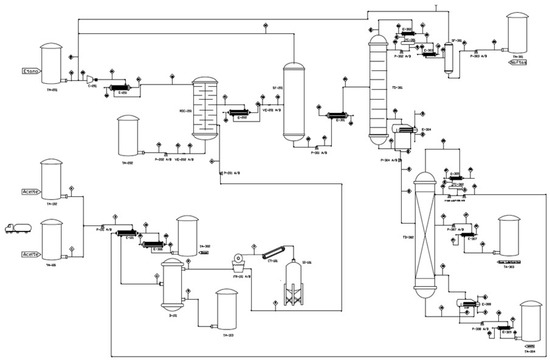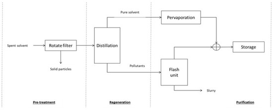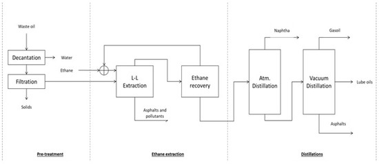 Unlike propane solvent, when ethane is utilised, further hydrogenation treatment after distillation is not needed because it takes apart pollutants of the waste oil. Specifically, it provides lower values of viscosity, sulphur content, phosphorus content and heavy metals content [47]. For this reason, ethane is the selected solvent for this process [51]. Thus, the selected process can be divided into modules (Figure 4).