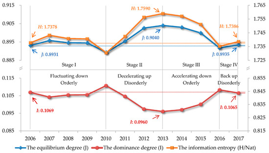 | Urban Construction Land Structure/% | The Information Entropy (H/Nat) | The Equilibrium Degree (J) | The Dominance Degree (I) | |||||||