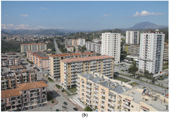Monticelli is a district in the city of Ascoli Piceno, Italy. It stretches two kilometres along a Roman road, the Via Salaria, which connects Rome to the Adriatic Sea. Its creation is tied to a desire that developed in the 1950s to govern expansion outside the historical centre in an area that was not urbanized at the time, in relation to the planned industrial development of the Tronto Valley, the largest urban centre of which is the city of Ascoli [59]. In the modification to the Regulatory Plan of Ascoli Piceno (1963–72), Leonardo Benevolo, one of the most emblematic figures in Italian architecture and urban planning, envisioned a city that developed linearly along the west-east axis. Up to the 1970s, Monticelli was an agricultural area. After the earthquake in 1972, however, some ‘emergency’ buildings started to rise here, including two skyscrapers in the eastern part to house those evacuated from the historical centre. In the span of just a few years, consistent urbanization consolidated around these two modern towers. Benevolo had identified a hierarchy of areas dedicated to different functions. These were served by an infrastructure system based on different levels of use: roads for quick decentralized passage (towards the bank of the Tronto River), central roads for internal mobility, and secondary roads orthogonal to the central axis (Figure 4a,b).