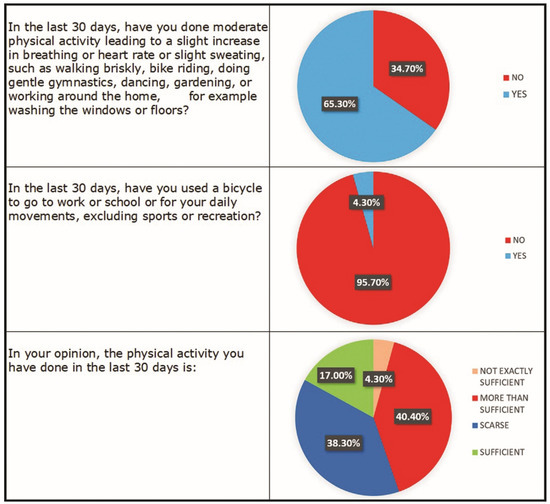 As for the health and well-being aspects of the neighbourhood, the research included the construction and administration of a questionnaire on aspects of daily family life. The questionnaire was based on indications for constructing the Community Profile in the Emilia-Romagna Region, leading to the Emilia-Romagna Territorial Social and Health Conference (Conferenza Territoriale Sociale e Sanitaria, CTSS) in 2008. The questionnaire consisted of 10 sections: (1) personal data of the household member; (2) characteristics of the macro area of the neighbourhood where the family lives; (3) safety; (4) accessibility to services; (5) social cohesion in the neighbourhood; (6) daily movements; (7) characteristics of the home; (8) quality of life in the home; (9) outdoor life; and (10) perceived quality of life. The aim of this work was to highlight the differences between the various areas of the district regarding family composition, level of education, degree of satisfaction, differences in lifestyles (outdoor life, car use, housing characteristics, safety, physical activity, etc.).