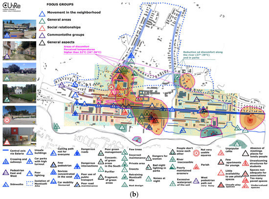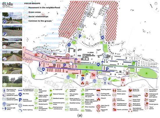 The main results of the research are summarized below in reference to the different steps in the proposed methodology: (a) urban-planning investigation; (b) construction of the neighbourhood health and well-being profile; (c) construction of the climate profile; (d) participatory process with citizens: focus groups; (e) climate and health actions; (f) concept design and identification of pilot projects; (g) assessment and selection of pilot projects. As specified previously, some of these steps—specifically points (a), (b) and (c)—were developed before the pandemic. Others—(d), (e) and (f)—were developed during the COVID-19 lockdown. The last step, (g), is still being developed.