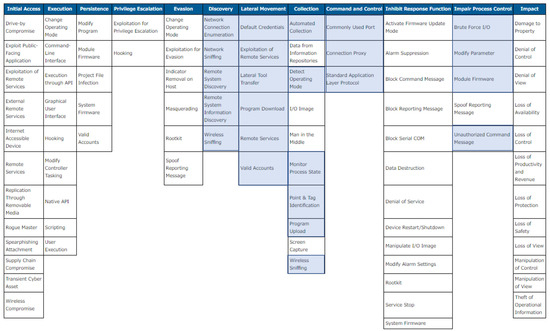 MITRE systematized a comprehensive knowledge base based on real world cyber incidents and formulated cyber attackers’ behaviour over multiple stages/phases. For each stage, a set of tactics taken by attackers was listed. While the original ATT&CK Matrix was for general IT systems, they later published a version for industrial control systems (ICS) [34], which is shown in Figure 3.