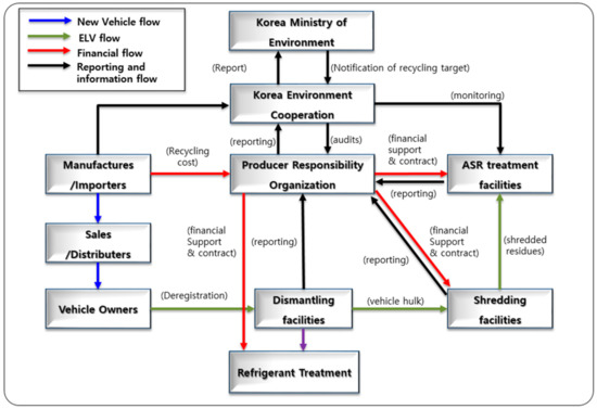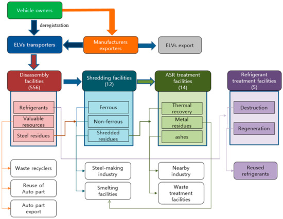 In South Korea, ELVs have been managed by the Act on Resource Circulation of Electrical & Electronics and ELVs since 2008, which is similar to the EU WEEE and ELV Directive. It regulates the restricted use and prohibition of toxic substances (e.g., cadmium, hexavalent chromium, lead, and mercury) in vehicles and promotes their recycling by establishing a resource-circulation system of ELVs. It set a mandatory target recycling rate of 95% including 10% energy recovery as a maximum in the beginning of 2015 [45]. Before 2015, the target recycling rate was 85%, including a 5% energy-recovery rate as a maximum. Each stakeholder should play a role in the recycling and treatment of ELVs by following the obligations at each stage (collection, disassembly, shredding, and disposal) according to the ELV recycling and treatment standards set by the act. For example, the automobile-dismantling facilities should comply with the recycling methods and standards and transfer the non-reusable and recyclable materials from ELV disassembly to shredding facilities for further treatment and the refrigerants to waste-gas-treatment facilities.