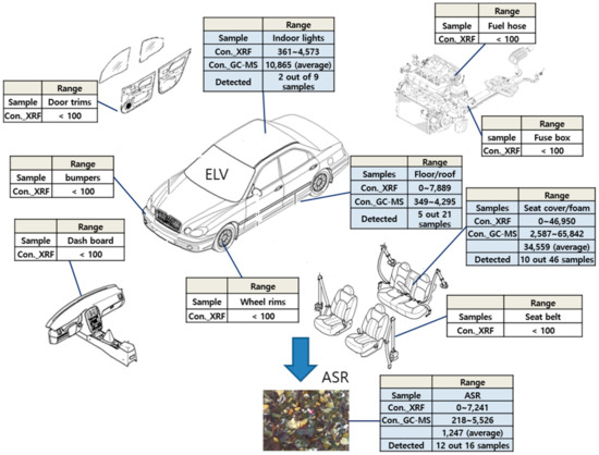 Figure 2 shows the levels of PBDEs in ELVs that were detected by the XRF and GC/MS analyses of a variety of plastic components in this study as well as the previous study [42]. As shown in Figure 2, seat fabrics (e.g., seat cover and seat foam) and ASR contained relatively high levels of PBDEs in ELVs. The detection rates were 21.7% (10 out 46 samples) for seat fabrics, while the ASR samples with the high detection rate of 75% (12 our 16 samples) contained PBDEs at an average of 1247 mg/kg. Indoor-light-plastic-cover and floor-cover materials often showed significant levels of PBDEs, but lower detection rates (22.2% for indoor light covers and 23.8% for floor covers and roof materials) were found.