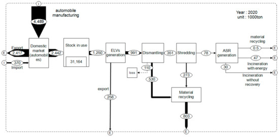 The large consumer demands for new vehicles have resulted in tremendous amounts of end-of-life vehicles (ELVs) waiting for proper treatment. In addition, as new cars equipped with modern technology such as artificial intelligence, an autonomous system and electric batteries with energy savings are coming to the markets at a growing rate, the quantity of ELVs may be expected to increase [7,8]. In 2020, approximately 950,000 ELVs were generated in South Korea [6], while 3.7 million ELVs in 2017 in Japan [9] and 6.1 million in 2018 from 27 EU countries [10] were generated.