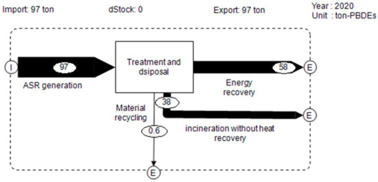 Figure 4 presents the substance flow of PBDEs in ASR from ELVs in South Korea. Most PBDEs present in ASR were processed for energy recovery (58 tons) or incineration (38 tons). It should be noted that there are no regulations on the monitoring of air emissions from brominated dioxins and furans upon incineration with or without energy recovery in South Korea, although brominated dioxins can occur during the incineration of BFR-containing plastics [17,42,50,51,52]. No data regarding the levels of brominated dioxins and furans from stack samples by emission monitoring of the facilities with ASR treatment have been reported so far.