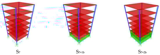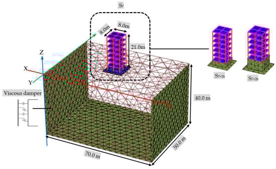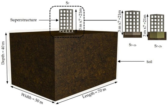 The three prototype superstructures consist of seven-story concrete frames with variable raft foundation levels (i.e., at near ground level (S7), −3 m (S7+1b), and −6 m (S7+2b) from ground level). The total height of the prototypes is 21 m. Each prototype model has double bays designed to be 8 m in and out of planes, and the bay span is 4 m. For basement stories, the prototype models have retaining walls around the building with a thickness of 250 mm. The dimensions of all columns and beams are 800 mm × 800 mm and 300 mm × 600 mm, respectively. The slab thickness is 160 mm. The mechanical properties of all elements are the same, in which the modulus of elasticity (E) is 25,742.96 MPa, and the average compressive strength (ƒc) is 30 MPa. The prototype models are supported on fixed and flexible bases. The configuration of the real models in the SSI system is shown in Figure 1. In addition, the actual dimensions of discretized soil layer over bedrock level used in the dynamic analysis are to be 70 m in length, 50 m in width, and 40 m in depth. The soil medium is silty clay with a shear wave velocity of vs. = 220 m/s and unit weight of γ = 17.8 kN/m3.