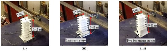 3D numerical models have been achieved through SAP2000 software as shown in Figure 3 to conclude the steel skeleton section properties by employing the required characteristics of scaled models in Table 4 and dimensions of scaled models. After several trials to adopt the required characteristics, the final dimensions of each floor plate are 160 mm × 160 mm × 3.5 mm while 7 mm × 1.5 mm × 420 mm as four vertical steel column plates. Additionally, four and eight vertical steel plates with dimensions 160 mm × 60 mm × 1.5 mm are used as retaining walls in the case of seven stories with one basement story (S7+1b) and two basements stories (S7+2b), respectively. The connection used between elements is welded, and the mild steel 240/350 is adopted. Consequently, Table 5 presents the adopted natural frequencies and total masses of three scaled models. It is observed that the maximum variations between required and adopted for natural frequencies and total masses do not exceed 2.6%. The three scaled models were assembled in the workshop, as depicted in Figure 4.